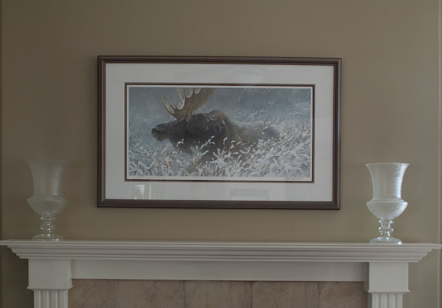 I wasted no time and went straight to Winners to find an eclectic assortment of treasures. Granted, I was starting with a framed print by Robert Bateman that I really love – it’s called ‘Winter Run’ and he could have been painting it from our deck – I have actually seen similar scenes around here. Well, I’ve seen moose and I’ve seen snow-covered branches – that counts, I think. Anyway this is what I came up with: