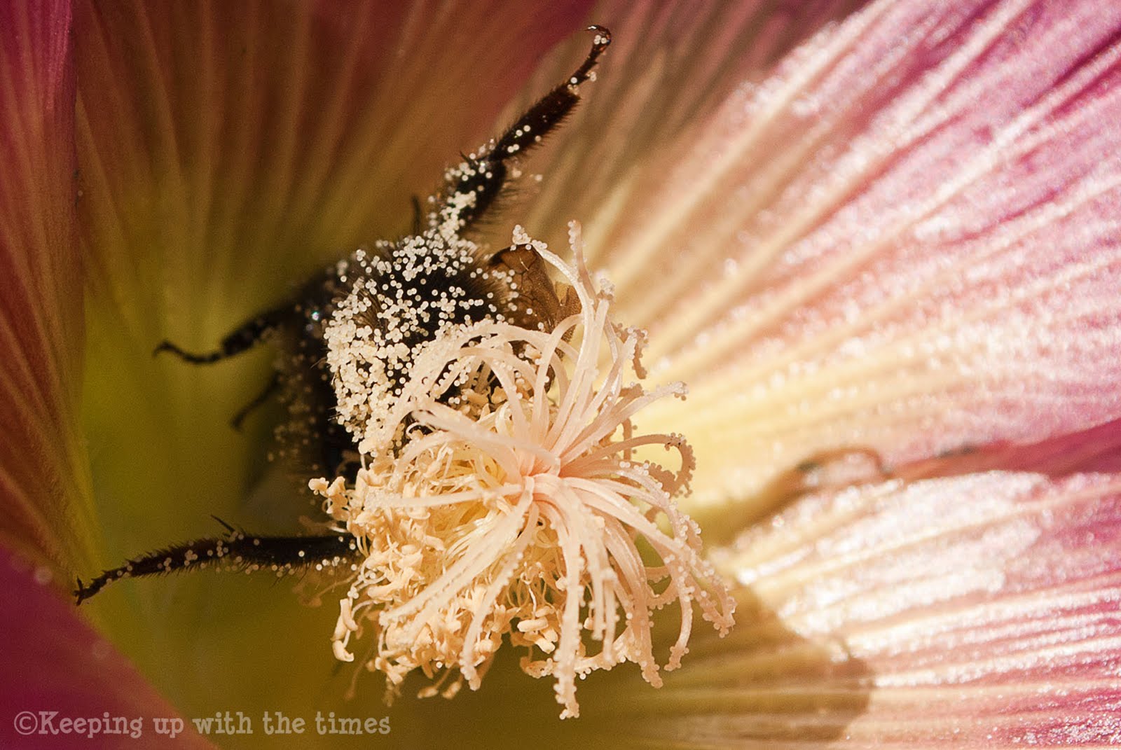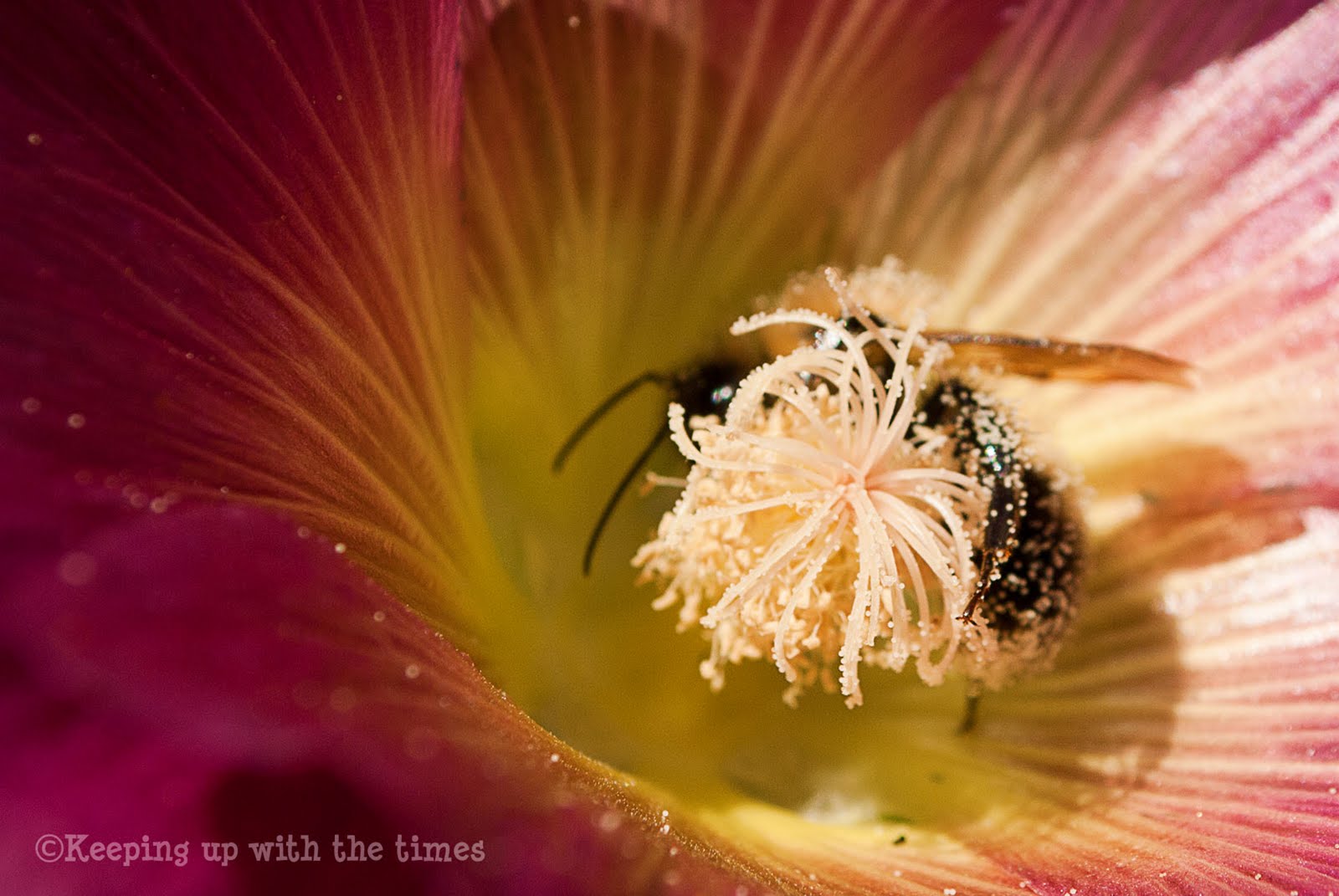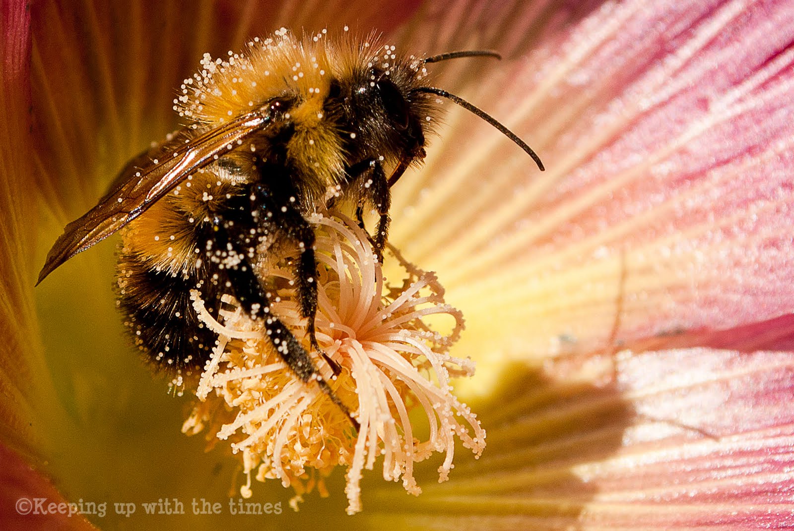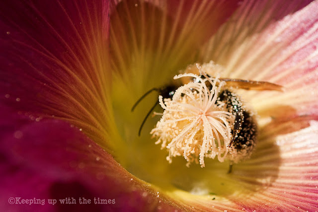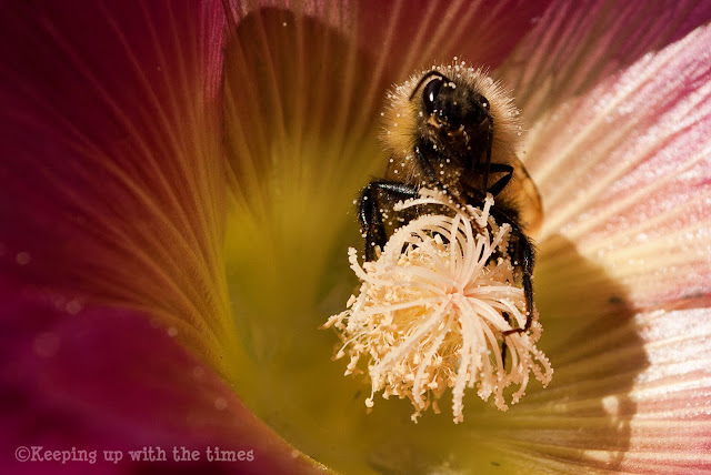 Just love these macro photos. I am a real fan of the bumblebee and rescued a whole hive this summer. The flowers are stunning too,is that a hollyhock? So pretty!